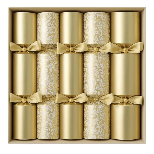 Luxury Christmas crackers alternating pure gold and gold floral embossed designs in a retail gift box with satin ribbons
